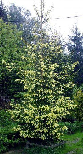 Atraktivní strom. Větve se ohýbají směrem vzhůru. Jehlice jsou krátké, lesklé, výrazně sytě zelené. Kutlivar 'Aureospicata' se vyznačuje tím, že jeho mladé jehlice mají žlutou barvu. Výška v dospělosti je kolem 12 m, proto se hodí spíše jako solitera.